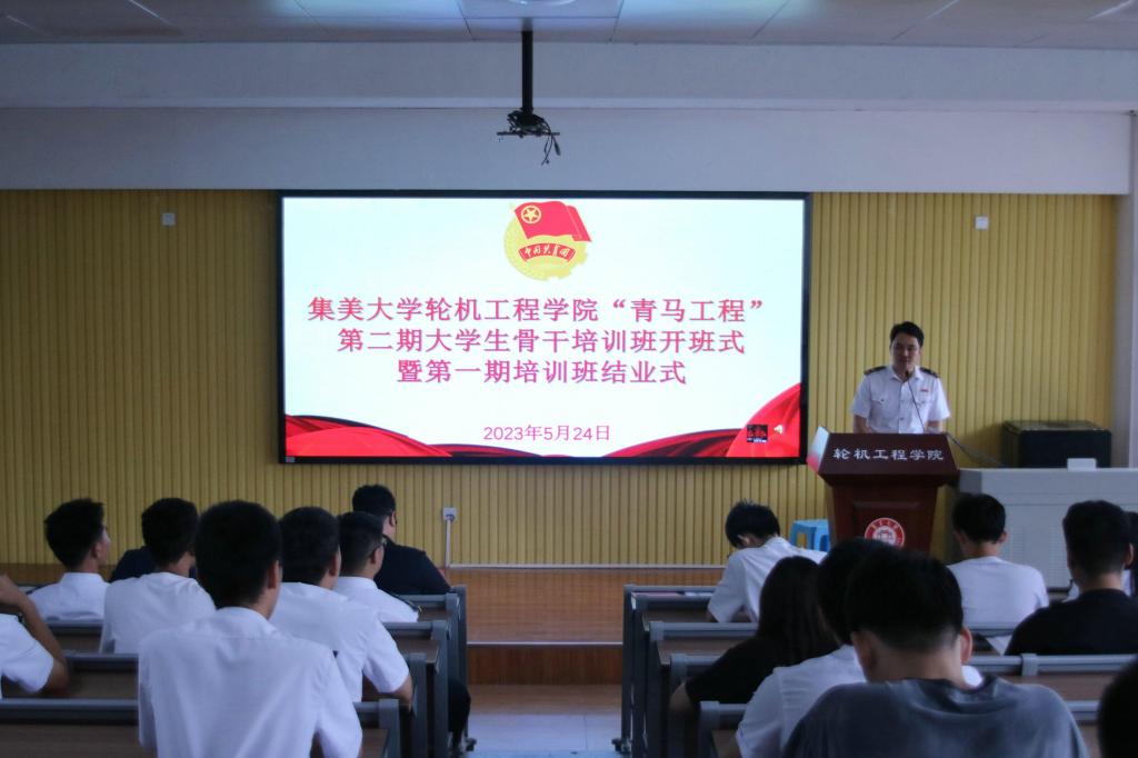 为推进学习贯彻习近平新时代中国特色社会主义思想主题教育走深走实,深入学习贯彻习近平新时代中国特色社会主义思想和党的二十大精神,认真贯彻落实习近平总书记关于青年工作的重要思想,轮机工程学院于5月24日举行学院第二期“青马工程”大学生骨干培训班开班式暨第一期培训班结业式。院党委副书记赖龙荣、院团委副书记王宇亮、全体辅导员和第一期和第二期大骨班全体学员参加了仪式。